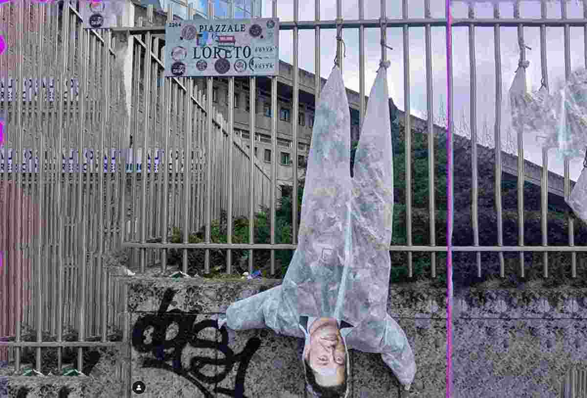 La scena riporta al simbolismo legato a uno dei momenti più iconici della storia italiana: l’esposizione del corpo senza vita di Benito Mussolini in piazzale Loreto, nel 1945.