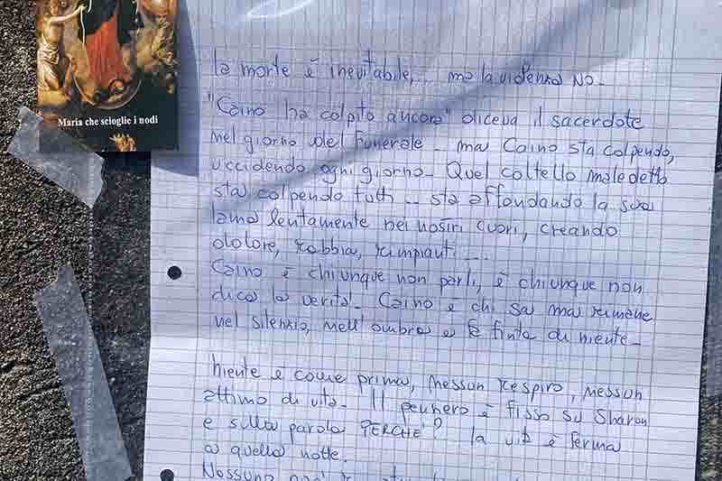 Il contenuto del messaggio è visibile a tutti, un messaggio molto chiaro, carico di emotività che suona come un monito: “Caino è chiunque non parli, chiunque non dica la verità. Nessuno può riportarcela indietro ma qualcuno può dare una spiegazione a tutto ciò. Non siate complici di questa brutalità: Sharon è figlia di tutti, è una parte della nostra vita. Chi sa non volga le spalle, non si nasconda, ma abbia il coraggio di dare giustizia a una vita.”