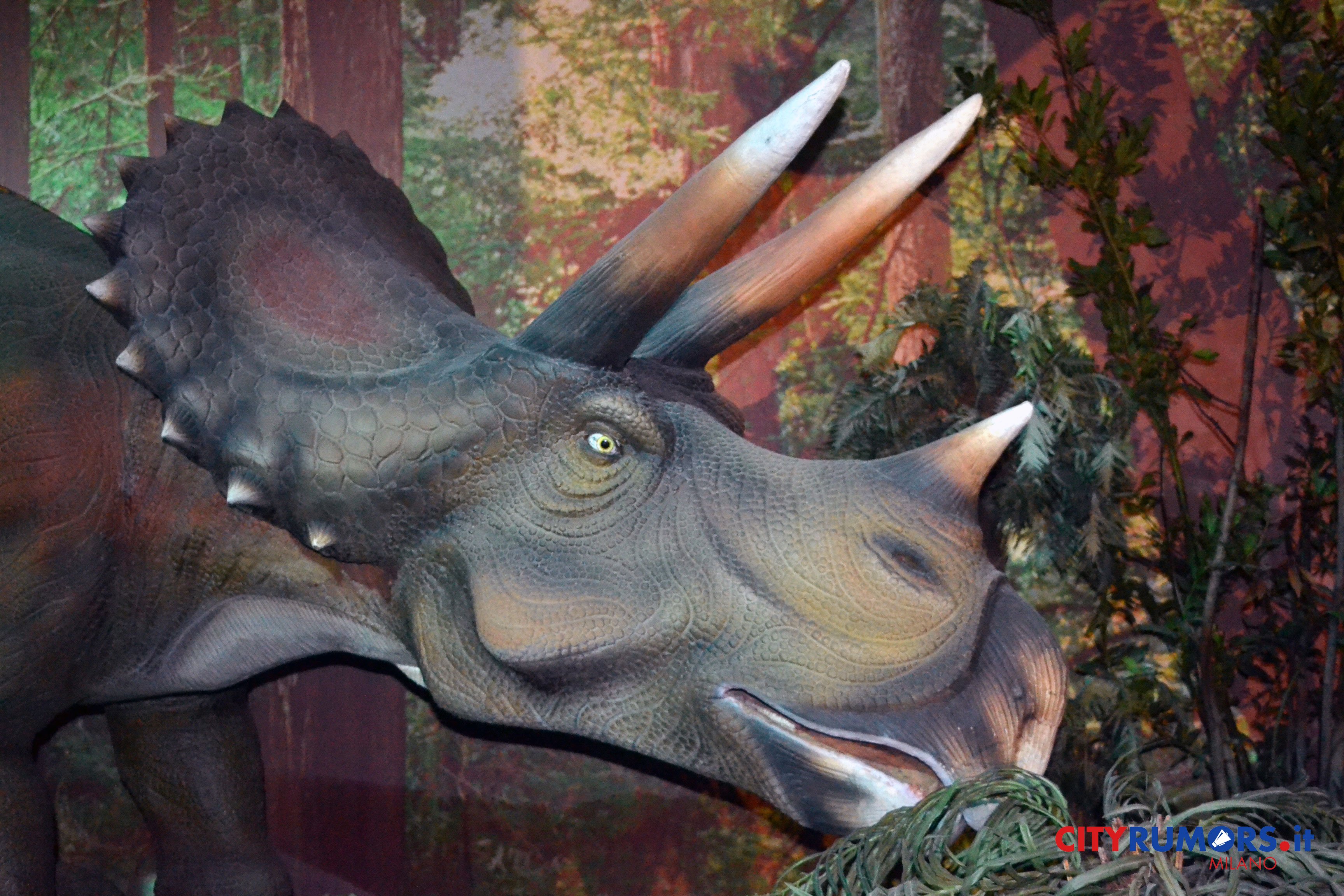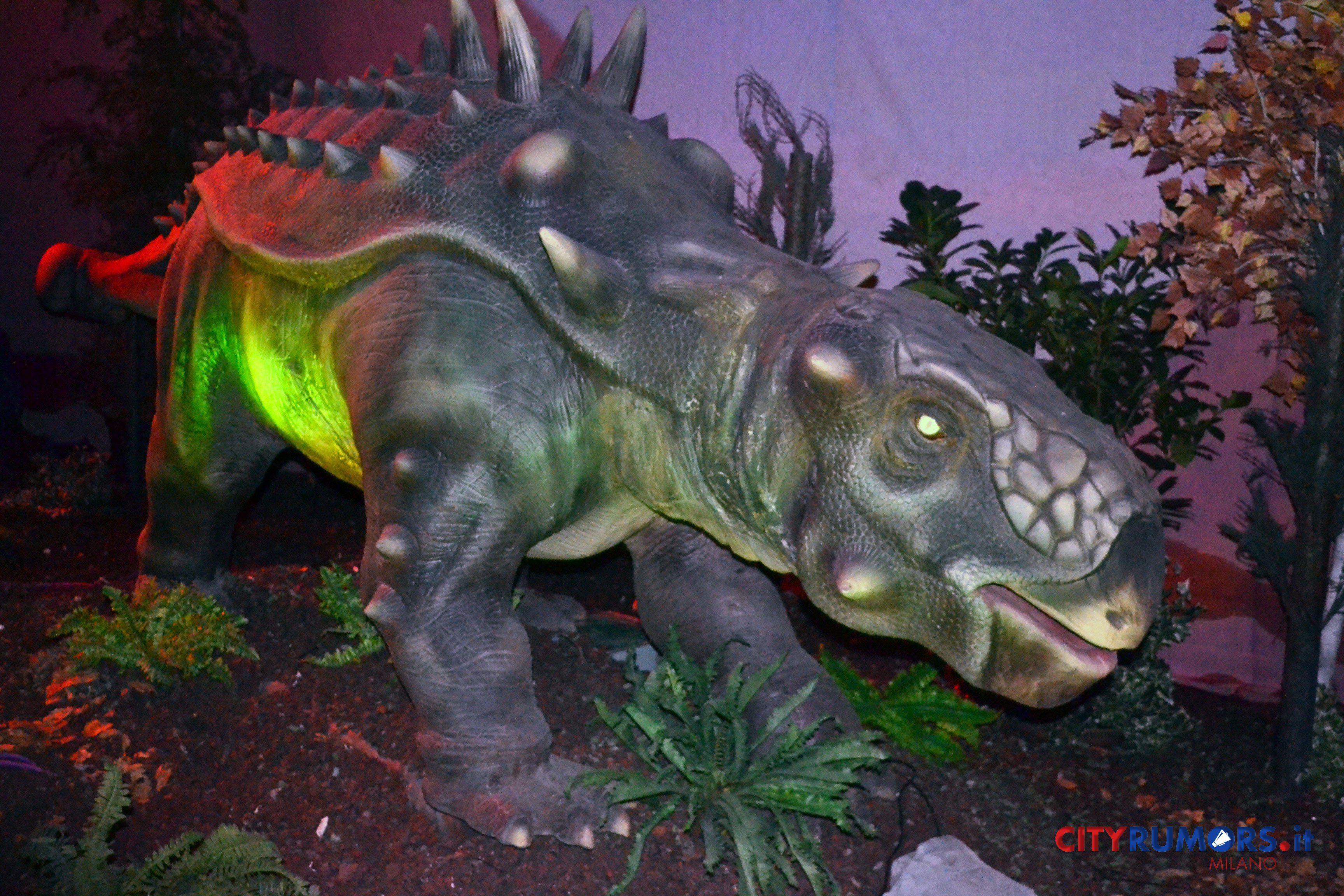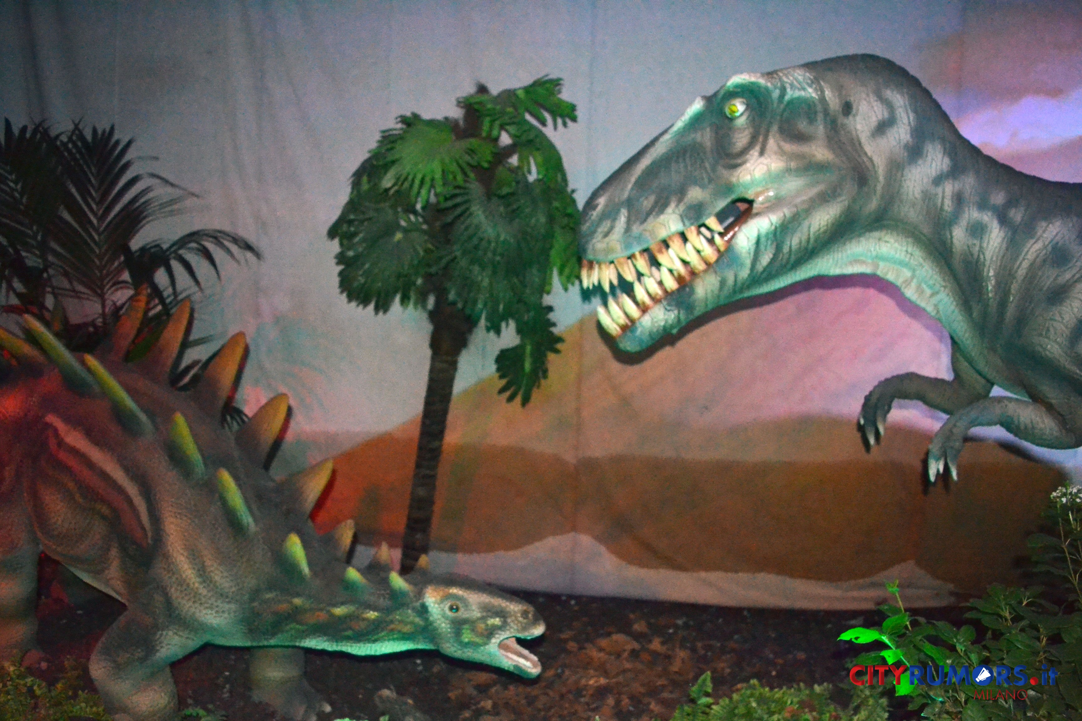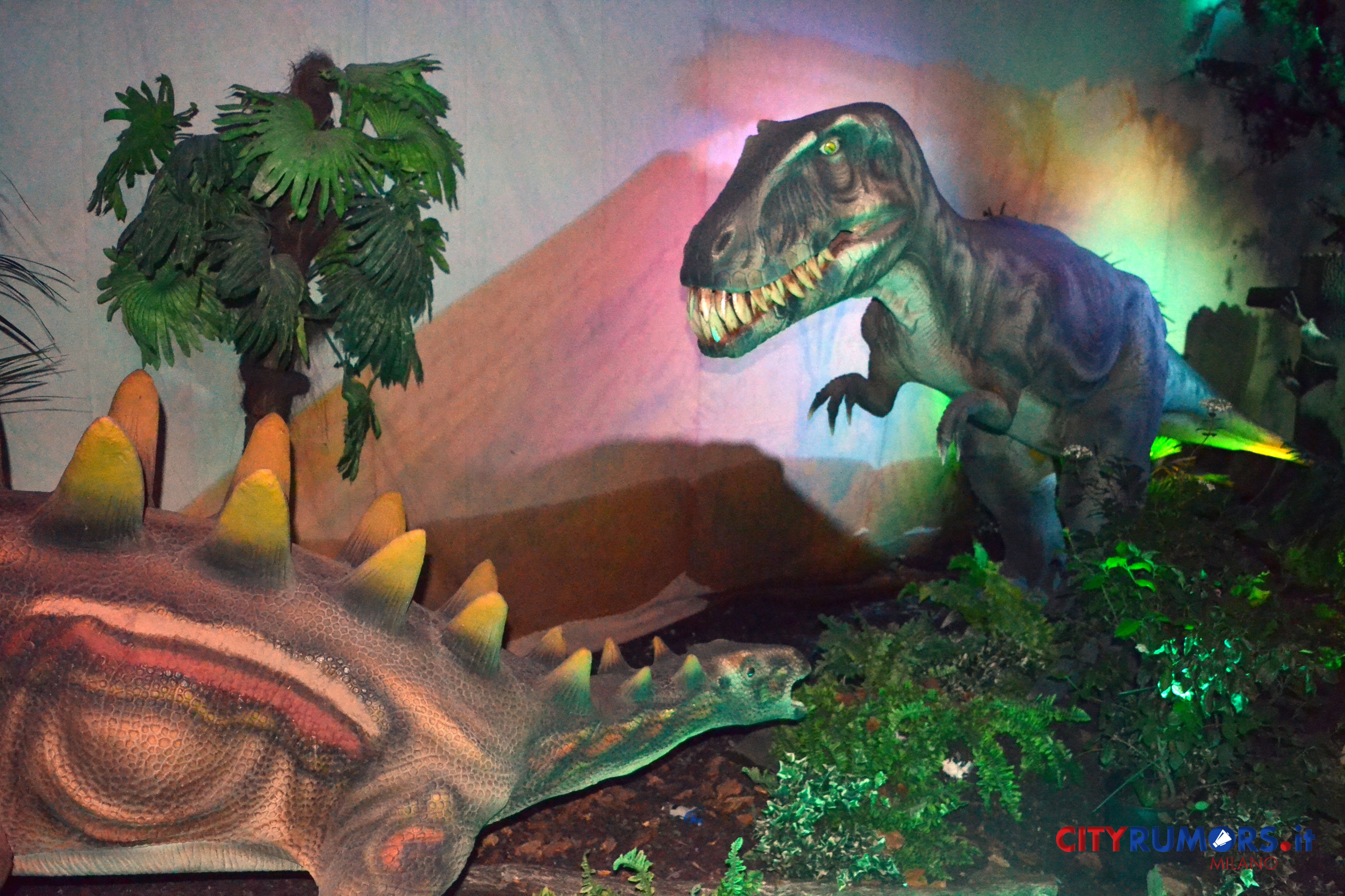 C’è poi chi, grazie ai robot nascosti, spalanca la bocca mostrando incredibili fauci come il Tirannosaurus Rex, le cui ricostruzioni ricorrono più volte e in diverse dimensioni nelle ambientazioni della Fabbrica del Vapore, fino all’ultimo enorme esemplare, che chiude il percorso espositivo congedando il pubblico con un agghiacciante saluto. Il dinosauro carnivoro più grande mai vissuto sulla terra fino alla scoperta del Gigantosaurus apre la bocca, muove la lingua brandendo i denti affilatissimi lunghi fino a 20 cm con una potenza di morso quattro volte quella del leone, con cui condivide l’appellativo di sovrano del regno animale. Settanta milioni di anni fa era al vertice della catena alimentare, molto agile e scattante nonostante il suo peso di oltre cinque tonnellate, 13 metri di lunghezza e 9 di altezza. Re incontrastato tra i vecchi dominatori del pianeta, una vera celebrità protagonista di libri, film e videogiochi ambientati nei mondi perduti, è il dinosauro più studiato anche grazie ai numerosi fossili rinvenuti in buono stato di conservazione.