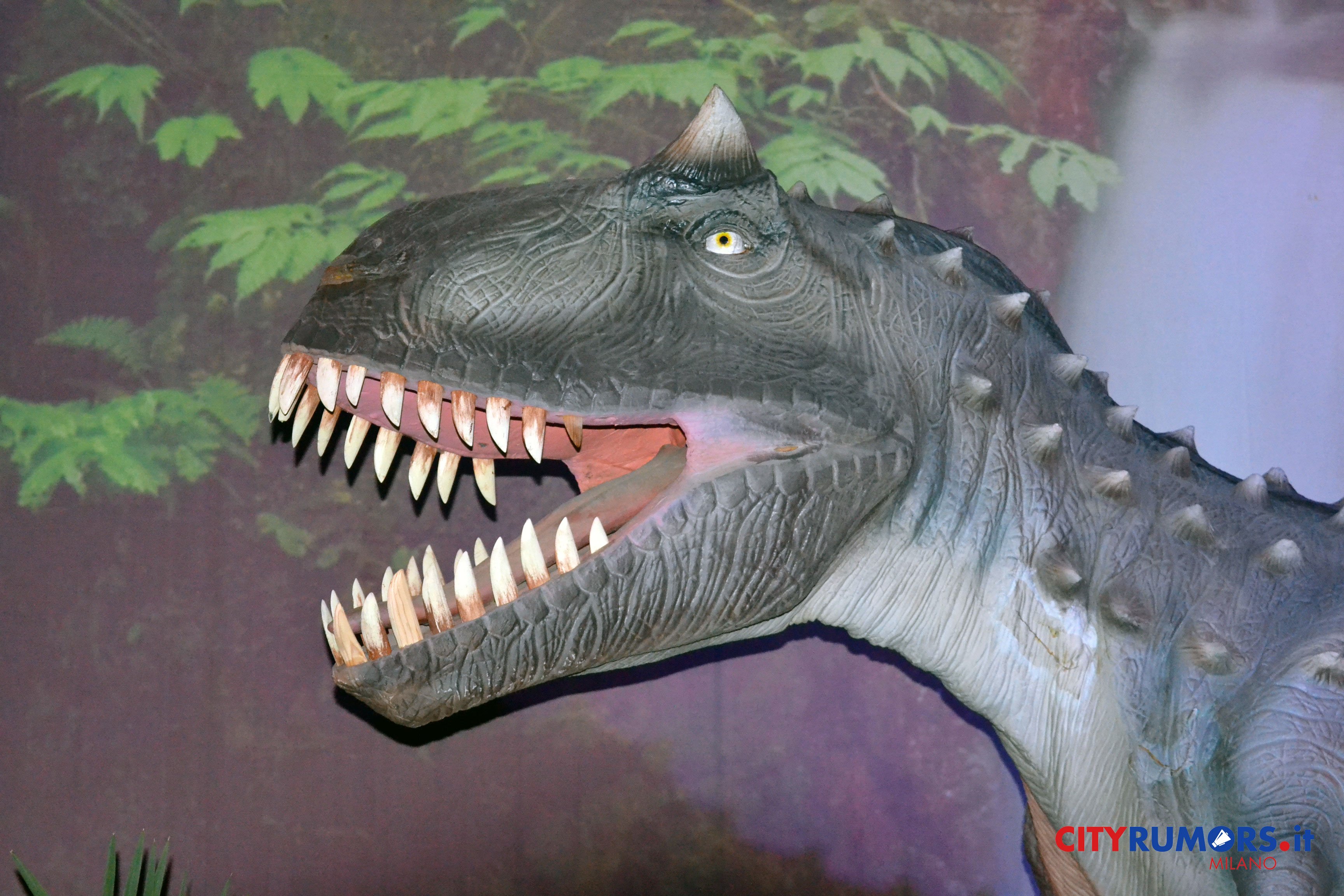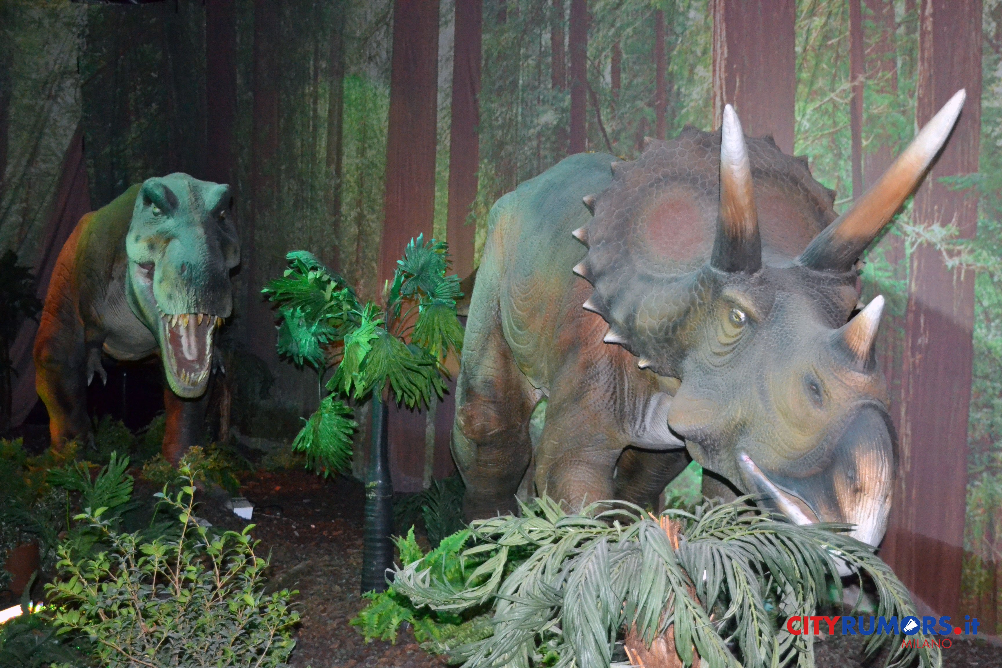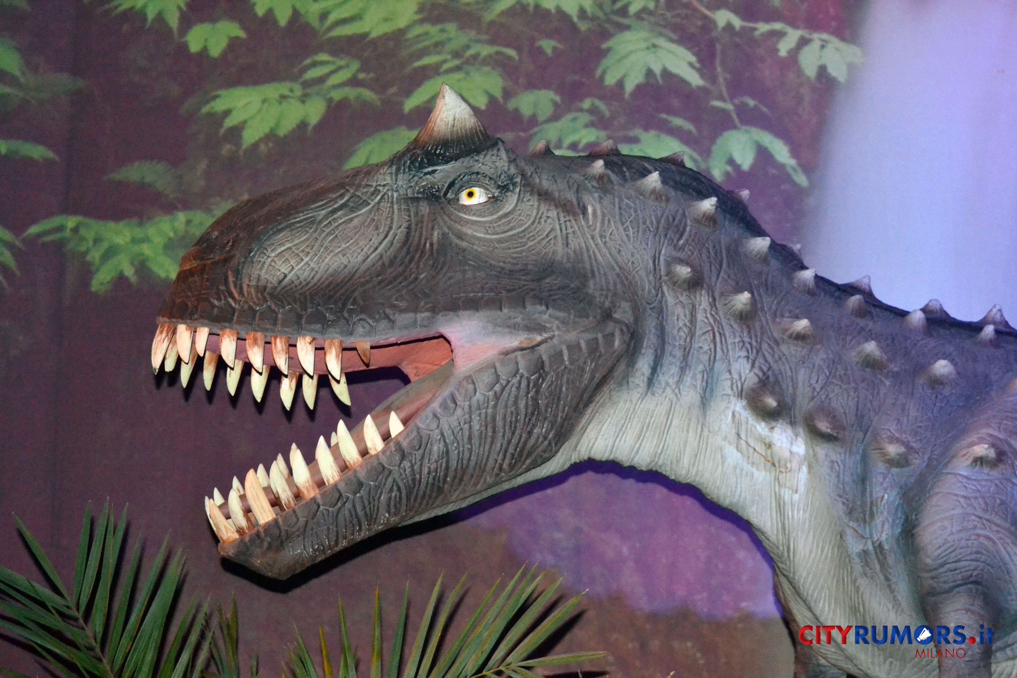 C’è poi chi, grazie ai robot nascosti, spalanca la bocca mostrando incredibili fauci come il Tirannosaurus Rex, le cui ricostruzioni ricorrono più volte e in diverse dimensioni nelle ambientazioni della Fabbrica del Vapore, fino all’ultimo enorme esemplare, che chiude il percorso espositivo congedando il pubblico con un agghiacciante saluto. Il dinosauro carnivoro più grande mai vissuto sulla terra fino alla scoperta del Gigantosaurus apre la bocca, muove la lingua brandendo i denti affilatissimi lunghi fino a 20 cm con una potenza di morso quattro volte quella del leone, con cui condivide l’appellativo di sovrano del regno animale. Settanta milioni di anni fa era al vertice della catena alimentare, molto agile e scattante nonostante il suo peso di oltre cinque tonnellate, 13 metri di lunghezza e 9 di altezza. Re incontrastato tra i vecchi dominatori del pianeta, una vera celebrità protagonista di libri, film e videogiochi ambientati nei mondi perduti, è il dinosauro più studiato anche grazie ai numerosi fossili rinvenuti in buono stato di conservazione.