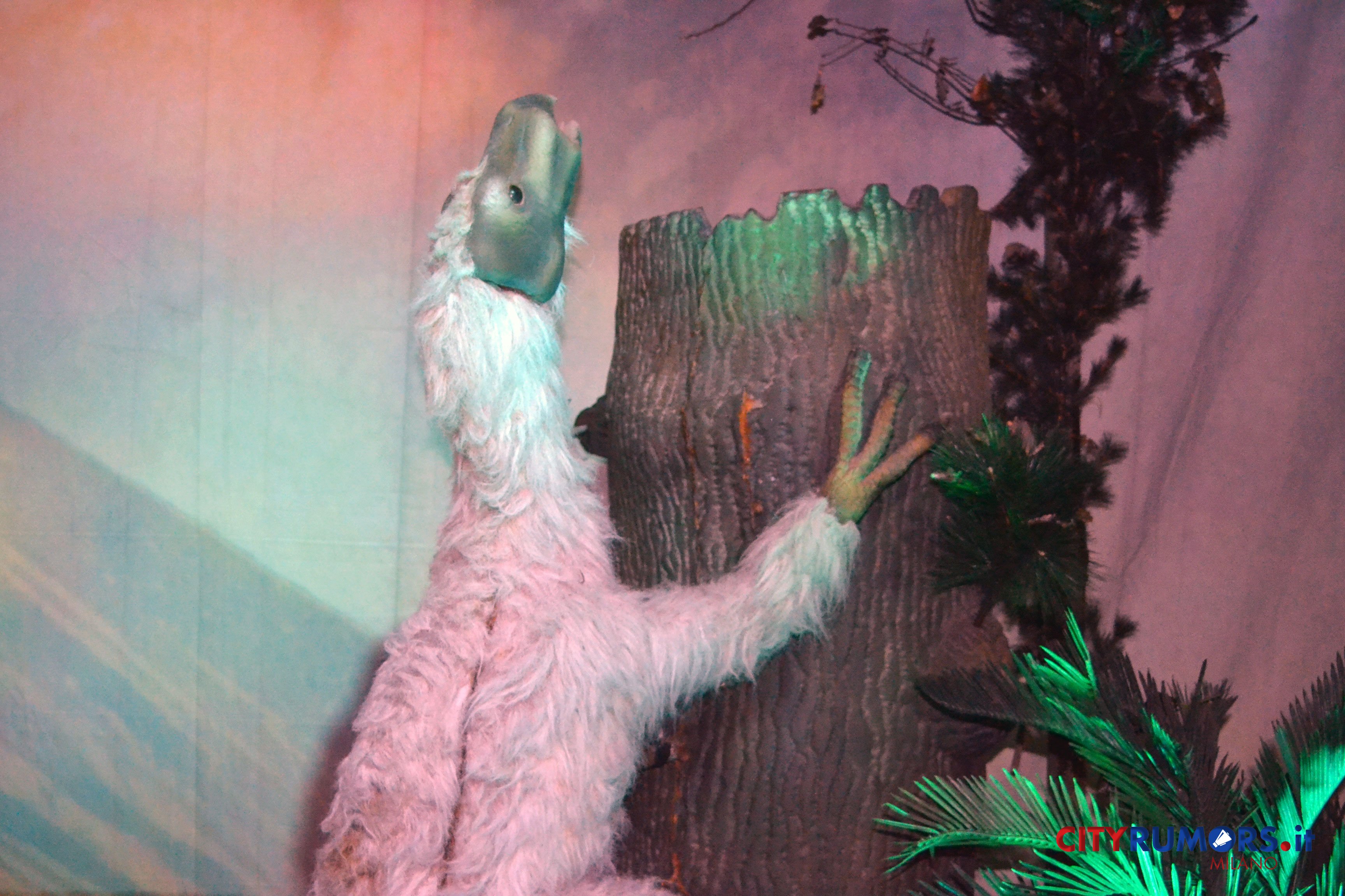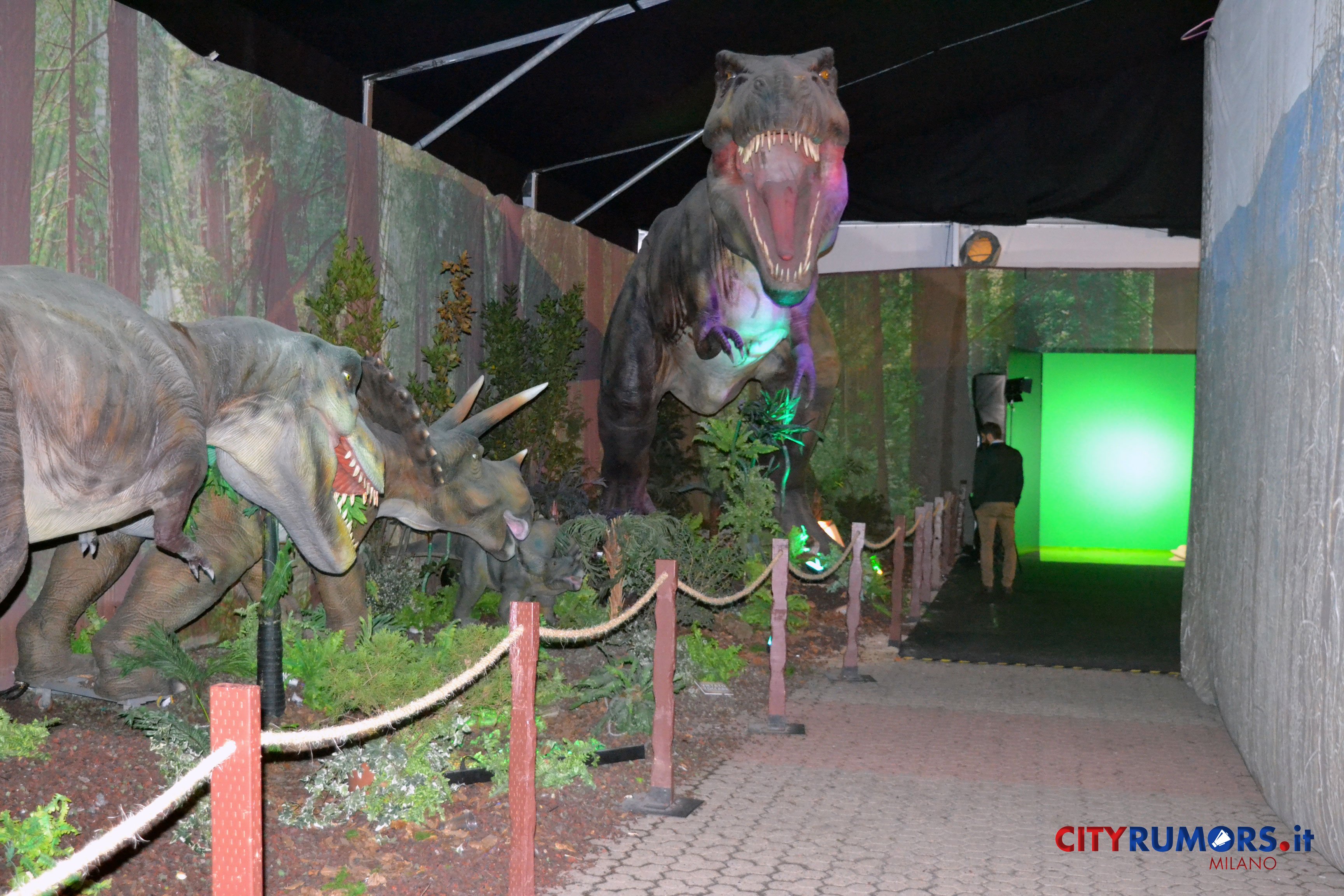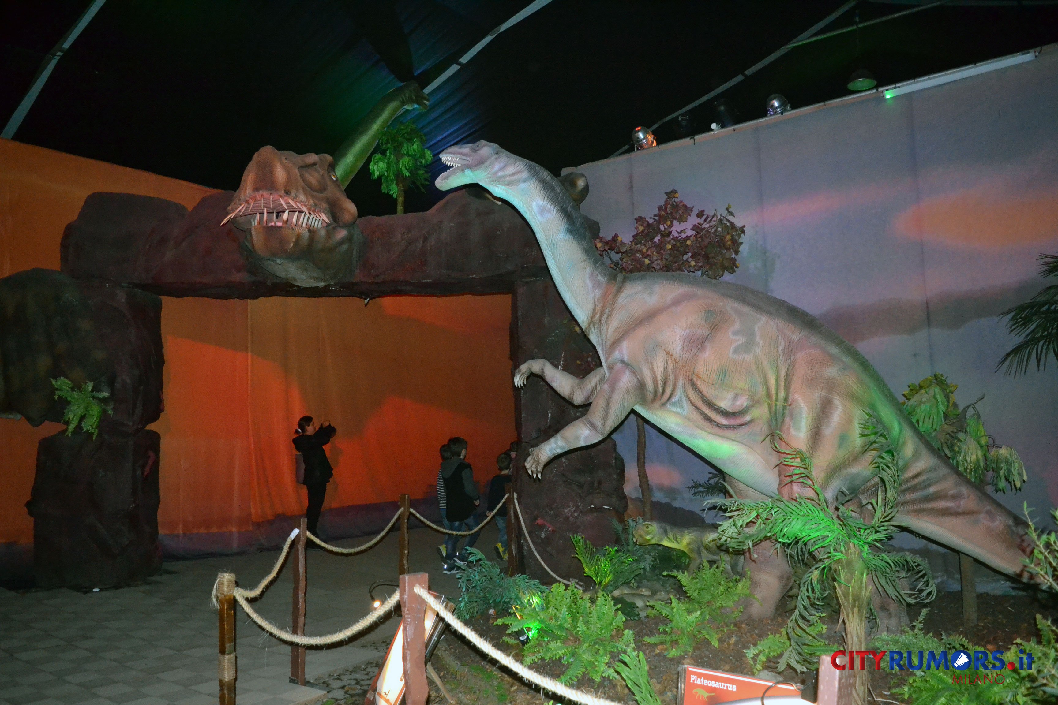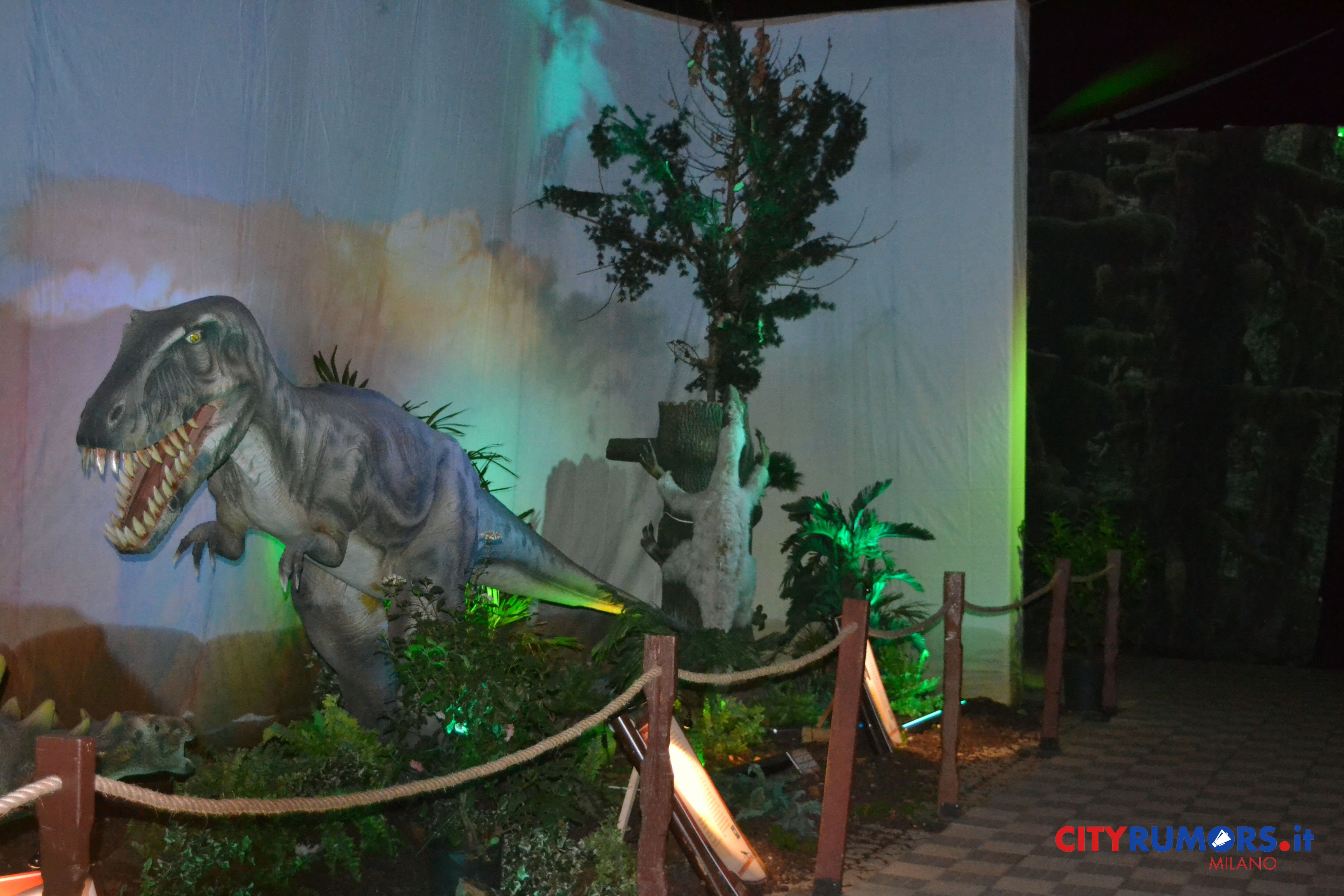 C’è poi chi, grazie ai robot nascosti, spalanca la bocca mostrando incredibili fauci come il Tirannosaurus Rex, le cui ricostruzioni ricorrono più volte e in diverse dimensioni nelle ambientazioni della Fabbrica del Vapore, fino all’ultimo enorme esemplare, che chiude il percorso espositivo congedando il pubblico con un agghiacciante saluto. Il dinosauro carnivoro più grande mai vissuto sulla terra fino alla scoperta del Gigantosaurus apre la bocca, muove la lingua brandendo i denti affilatissimi lunghi fino a 20 cm con una potenza di morso quattro volte quella del leone, con cui condivide l’appellativo di sovrano del regno animale. Settanta milioni di anni fa era al vertice della catena alimentare, molto agile e scattante nonostante il suo peso di oltre cinque tonnellate, 13 metri di lunghezza e 9 di altezza. Re incontrastato tra i vecchi dominatori del pianeta, una vera celebrità protagonista di libri, film e videogiochi ambientati nei mondi perduti, è il dinosauro più studiato anche grazie ai numerosi fossili rinvenuti in buono stato di conservazione.
