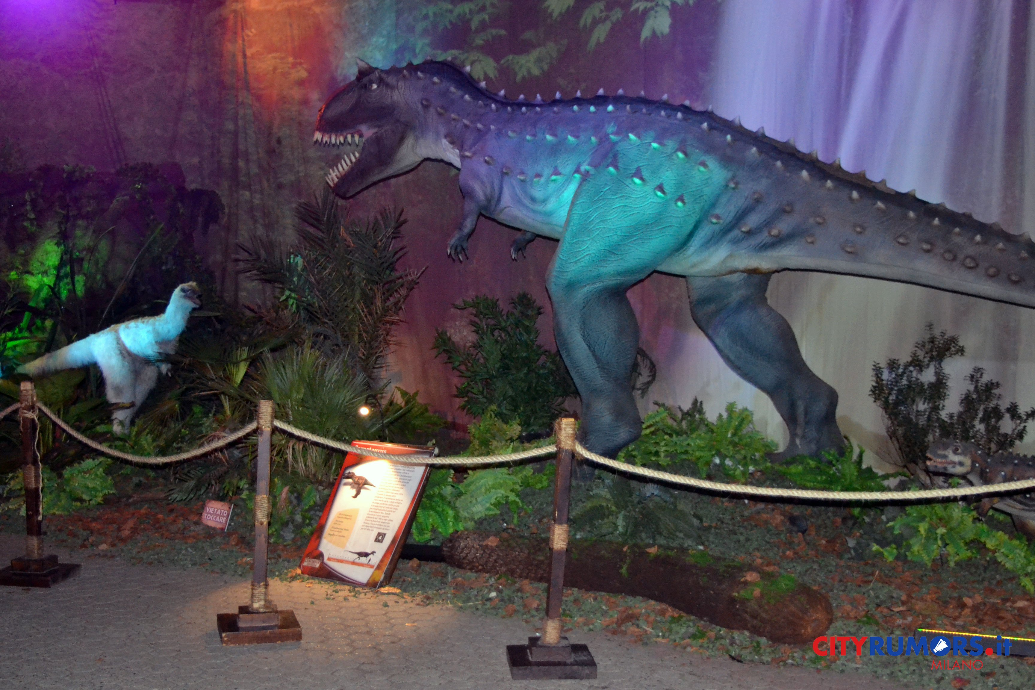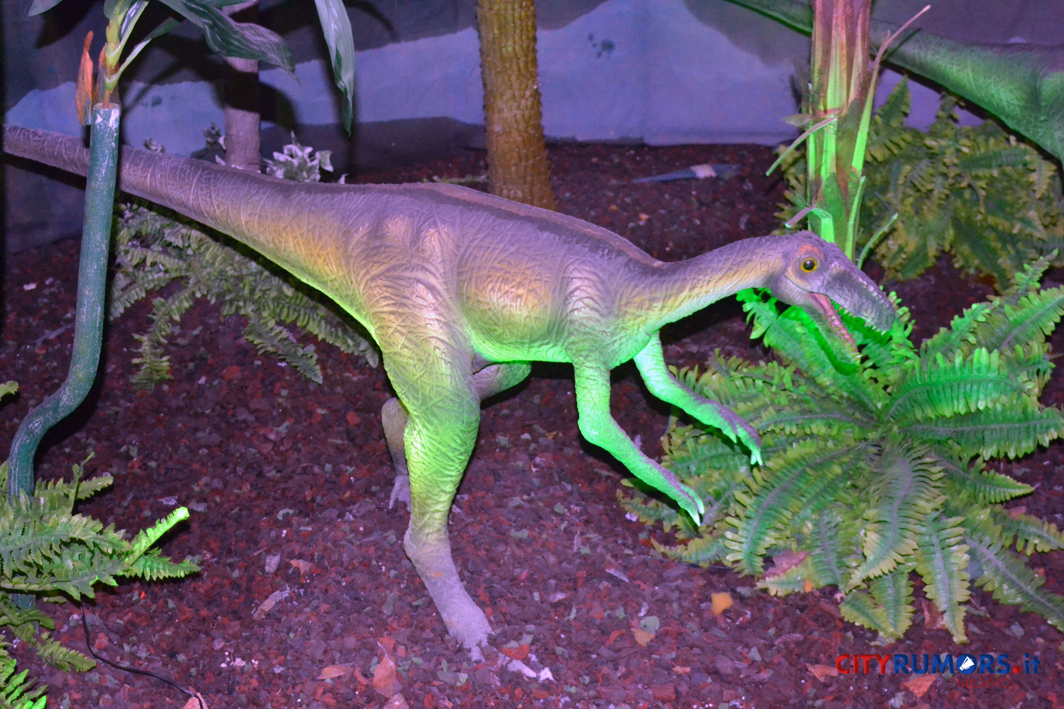 Nessuno dei trenta dinosauri in mostra riproduce un esemplare trovato in Italia, eppure uno dei migliori esempi al mondo d’impronte di tessuto molle in un fossile di dinosauro (conteneva – caso più unico che raro – parte degli organi interni) è stato rinvenuto in Campania, vicino a Benevento, nella zona di Pietraroja, un importante giacimento di pesci fossili dove 110 milioni di anni fa il territorio era caratterizzato da piccole isole, un ambiente ideale per i piccoli predatori come il giovane celurosauro Scipionyx samniticus (detto Ciro) vissuto nel Cretaceo inferiore, scoperto nel 1998. Tra le spiegazioni di questa mancanza, forse la taglia dell’esemplare, troppo modesta per impressionare un pubblico a caccia di brividi e forti emozioni.