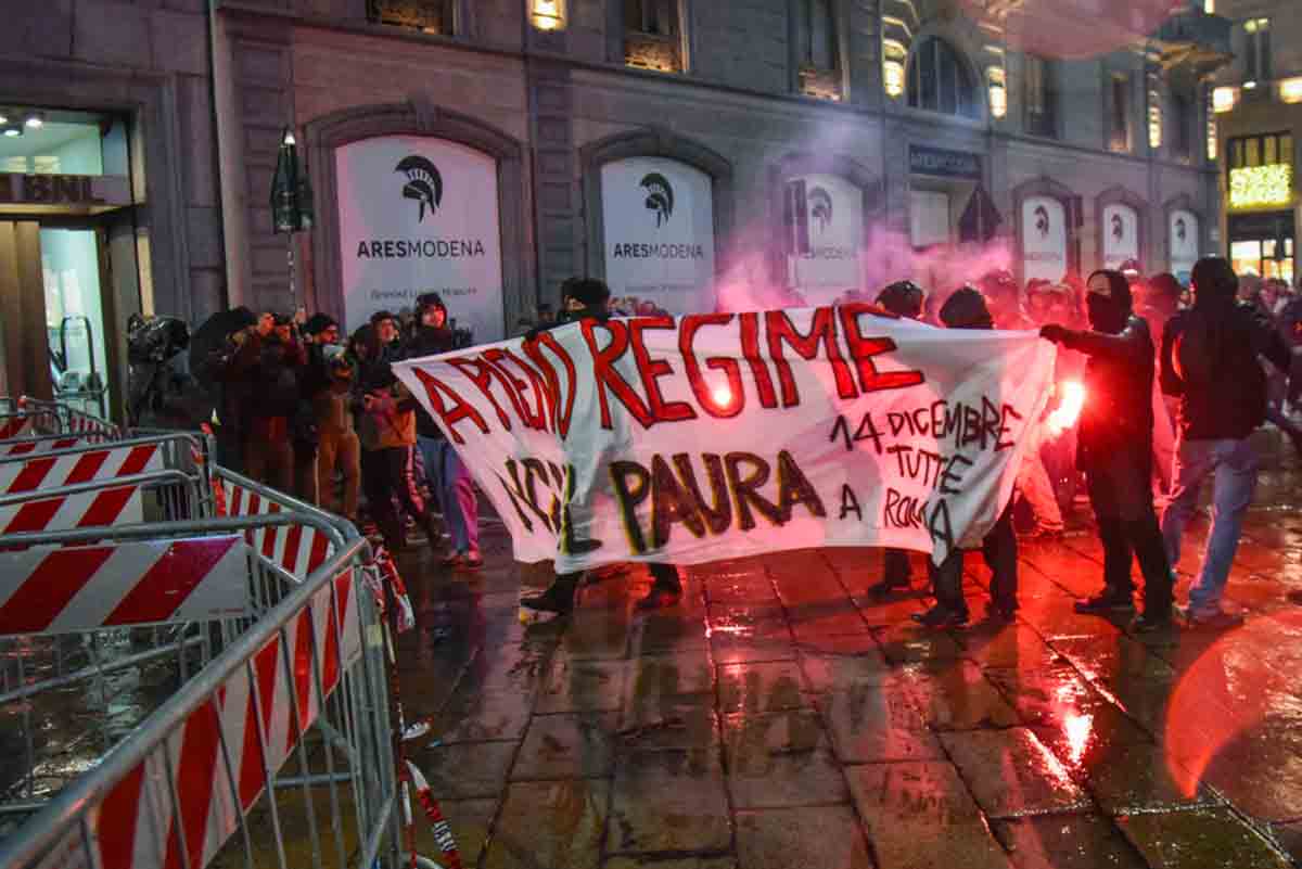 In precedenza un flash mob organizzato dal centro sociale Cantiere ha srotolato un tappeto rosso ricoperto di letame, con i volti della Premier Giorgia Meloni, del ministro Matteo Salvini e di Ignazio La Russa. Alcuni cartelli contro la guerra, il genocidio in Palestina e il governo sono stati esposti accompagnati da fumogeni e slogan.
