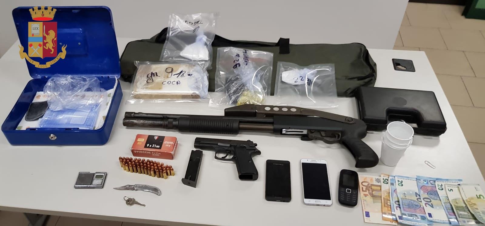 In casa sono state trovate ripetute prove dell’attività criminale: sequestrato un chilo di cocaina, circa 100 grammi di hashish, una pistola semiautomatica 9×21 con 50 cartucce custodita in una scatola nera in plastica con lucchetto (trovata all’interno di un mobile del salone nascosta tra vestiti e risultata rubata a Varese), un fucile a pompa calibro 12 custodito in una borsa porta-fucile (sotto il materasso nella camera da letto) e risultato rubato a Paderno Dugnano, un bilancino di precisione, 3 telefoni cellulari e poco più di 200 euro in contanti.