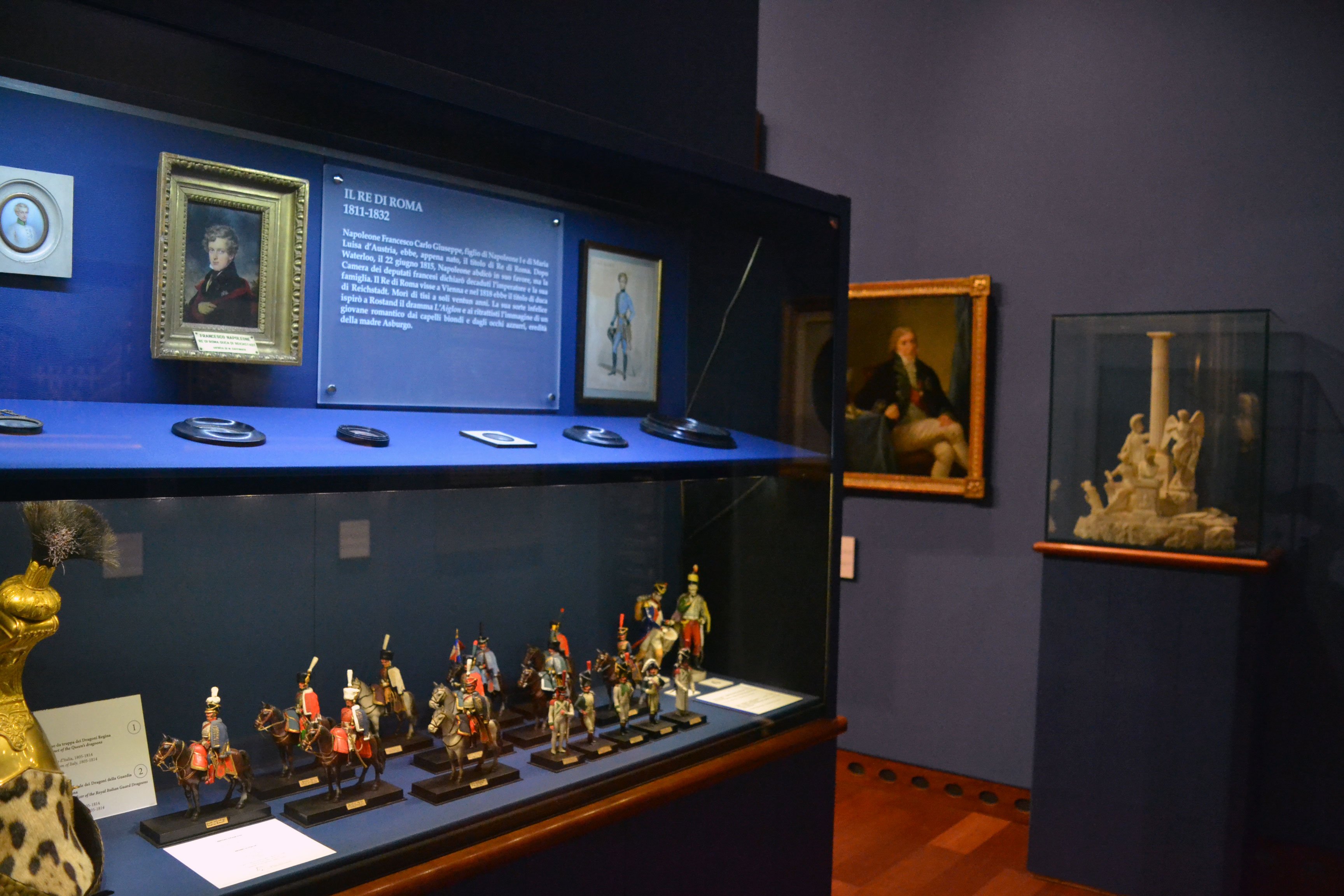Le guerre tra Settecento e Ottocento sono l’equivalente della globalizzazione di oggi e così vestire alla ussara diviene una moda transnazionale che contagia i reggimenti napoleonici come gli eserciti nemici. C’è infatti un colbacco di pelo e lo shako mirliton anche sul tavolo del generale di cavalleria austriaco Albert von Neipperg, raffigurato con la tradizionale giacca slim fit ricoperta di alamari, la benda a coprire l’occhio perso nella campagna dei Paesi Bassi. Sarà lui, nel 1821, dopo la morte di Napoleone, a prendere in moglie Maria Luisa d’Austria, già sposa del Bonaparte nel 1810 per suggellare l’alleanza con Vienna in vista della campagna di Russia. Nella stessa vetrina dedicata all’esercito asburgico, compare anche l’Arciduca e arcinemico di Napoleone, Carlo d’Asburgo. Il figurino è ritratto a cavallo nel 1809 durante la battaglia di Aspern-Essling, vicino a Vienna, costata cara a Napoleone, e si ispira al monumento equestre collocato tuttora nella Heldenplatz della capitale austriaca.