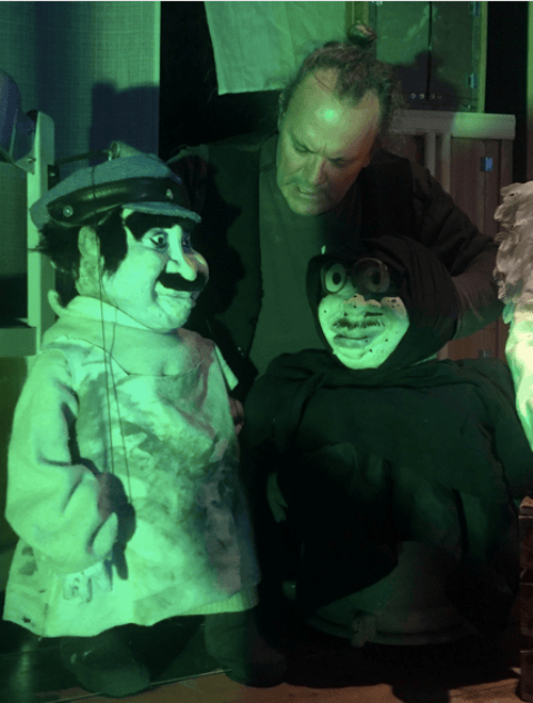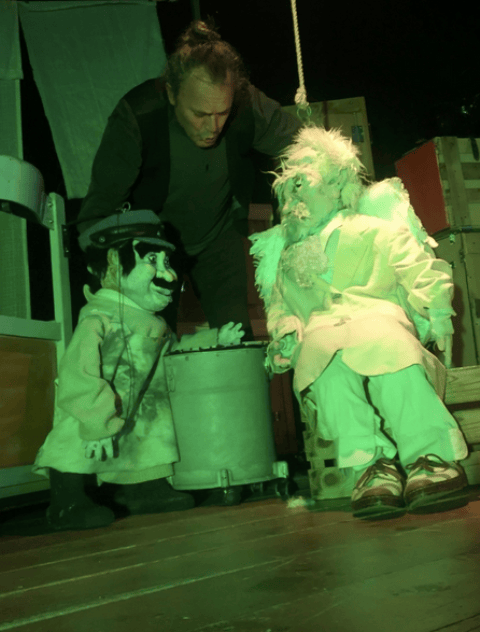 La storia, tragicomica, è ambientata in un immaginario borgo ligure. Tutti i protagonisti sono pupazzi mossi a vista dall’attore, in una confusione di casse, cassette, carrucole e paranchi che ricreano, insieme al suono delle onde e ai canti polifonici della tradizione locale, un ambiente marino. L’incontro casuale di un vecchio angelo caduto dal cielo con gli abitanti del villaggio è una grande novità, che porta scompiglio.