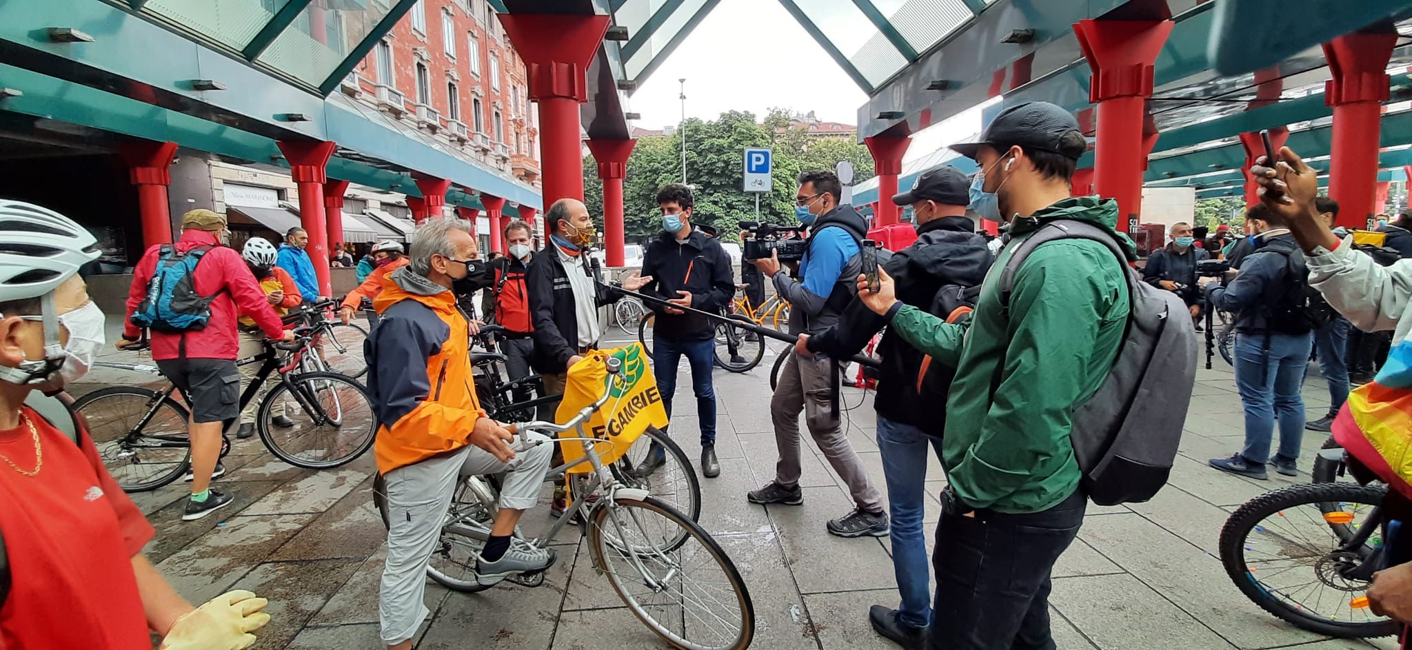 Un protesta pacifica “contro il divieto di trasporto delle biciclette sui treni lombardi: un provvedimento non solo chiaramente discriminatorio, ma contro l’economia, la dignità, il lavoro, il buon senso, la sostenibilità. Le nostre biciclette saranno la migliore garanzia di distanziamento fisico”, dicono gli organizzatori. Presente, tra i manifestanti, anche Giovanni Storti del trio comico Aldo, Giovanni e Giacomo.