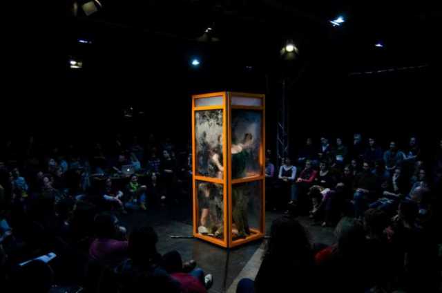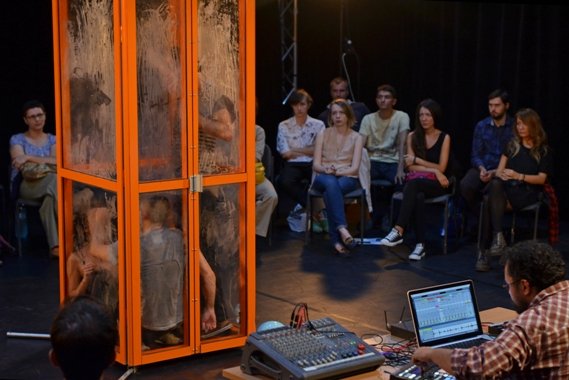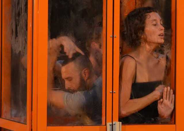 I danzatori sono tre e sono accompagnati da un ensemble musicale che agisce da vero e proprio interprete. I tre performers condividono lo spazio ristretto di una cabina telefonica (e l’aria racchiusa e sempre più ridotta), alla ricerca di nuovi equilibri e dinamiche di relazione, in un crescendo di tensione e in un moltiplicarsi delle possibilità. Contemporaneamente la musica del sound designer ,Vlaicu Golcea, “dialoga” dall’esterno con il terzetto in scena, aggiungendo allo spazio fisico un presente spazio sonoro, attraverso musiche e rumori in tempo reale o registrati, trasformati e mixati in diretta.